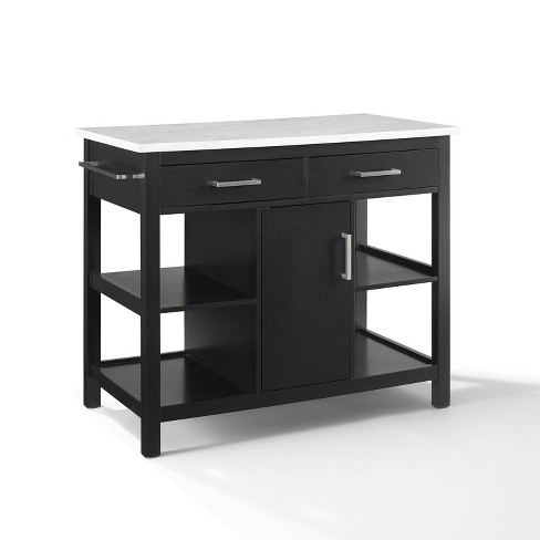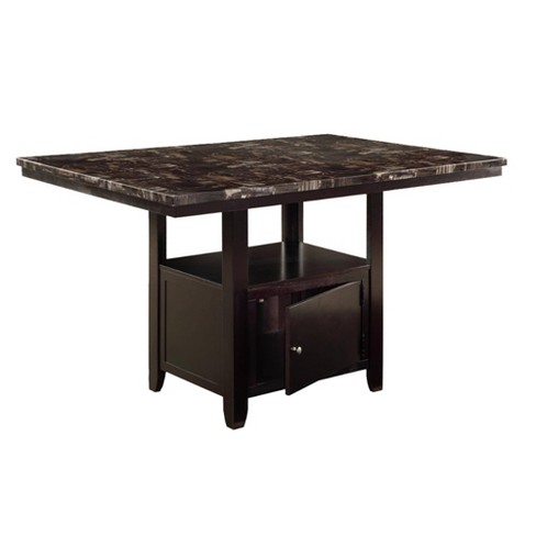 Crafted of manufactured wood with faux granite laminate veneers the tabletop strikes a clean lined square silhouette with smooth straight sides.